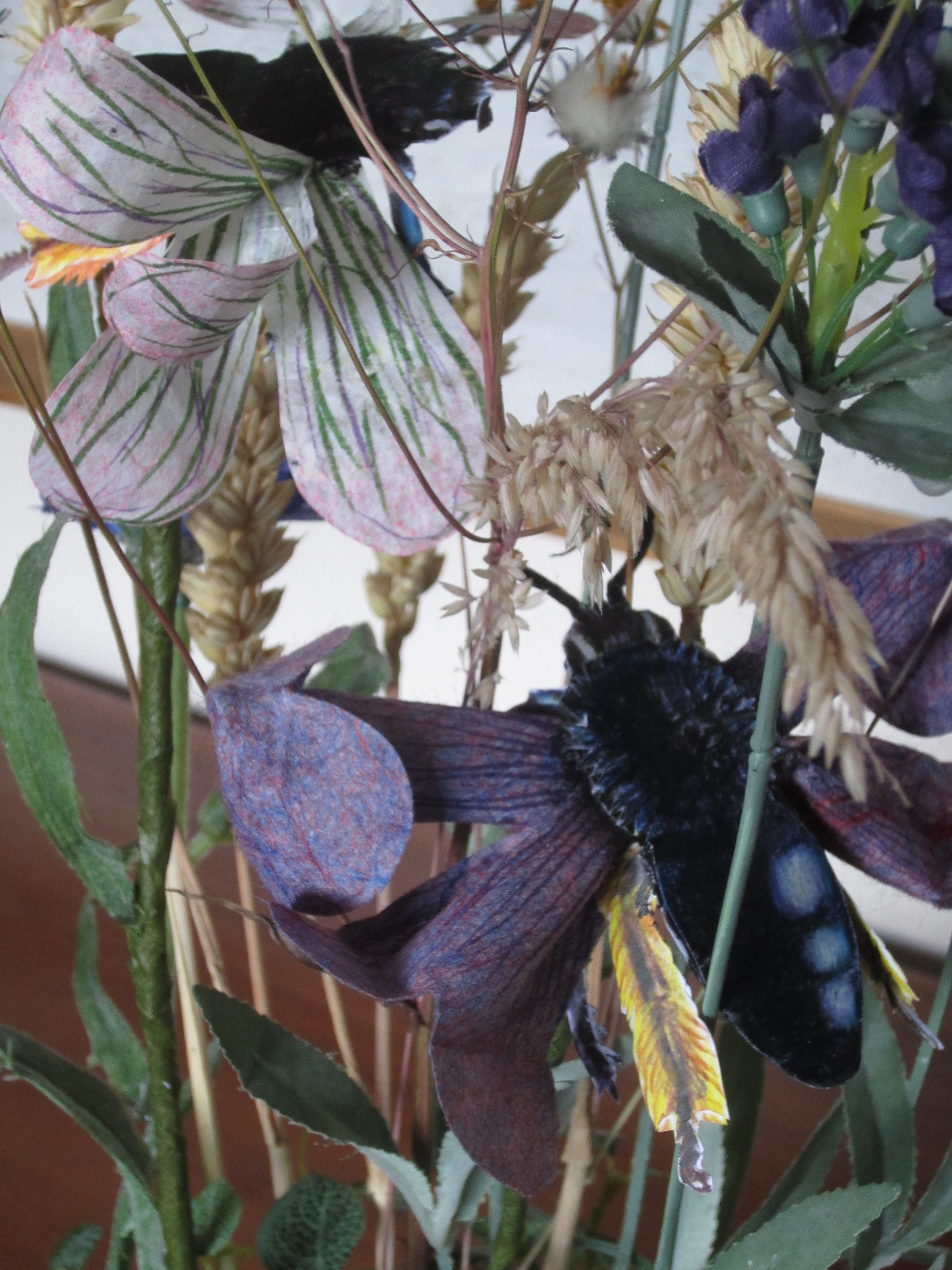 Two insect/plant hybrid sculptures created for the Coastal Currents arts festival. The pieces demonstrate the interdependence of lifeforms, using insects indigenous to my home environment. In particular, the Potter Flower Bees which feature in Symbiosis II are endangered. One of the few remaining colonies in the UK are located close to me, near Seaford. They feed on and pollinate plants such as Bird’s Foot Trefoil, Wild Radish and Purple Vetch, which I have transformed into wings for my paper sculptures. Part of the inspiration for this work came from an important research report about these bees by Rebecca Evans and Simon Potts of the University of Reading, published by Friends of the Earth.