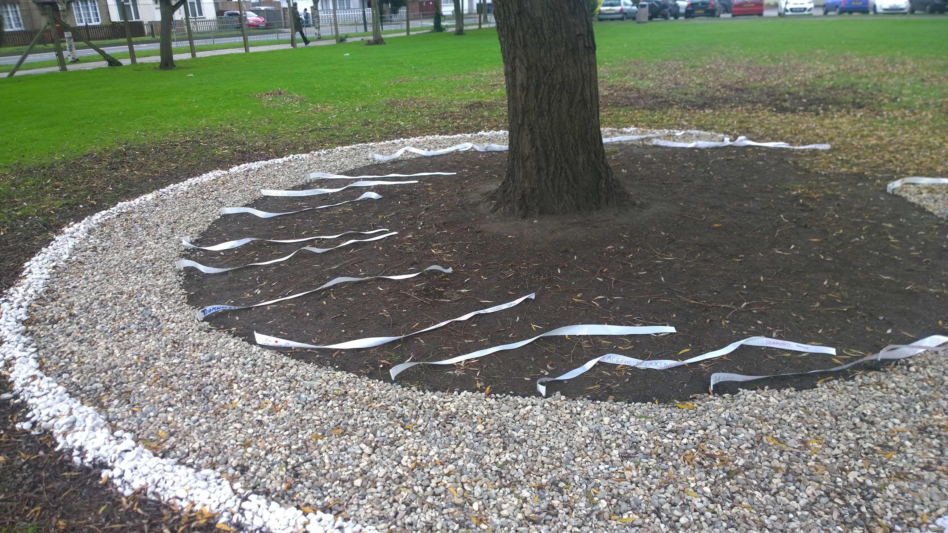 Sculpture project with companion secondary schools in Harrow, creating a circle of nuture in pebbles and poetic thoughts around a magnificent willow in prime position in the grounds.
