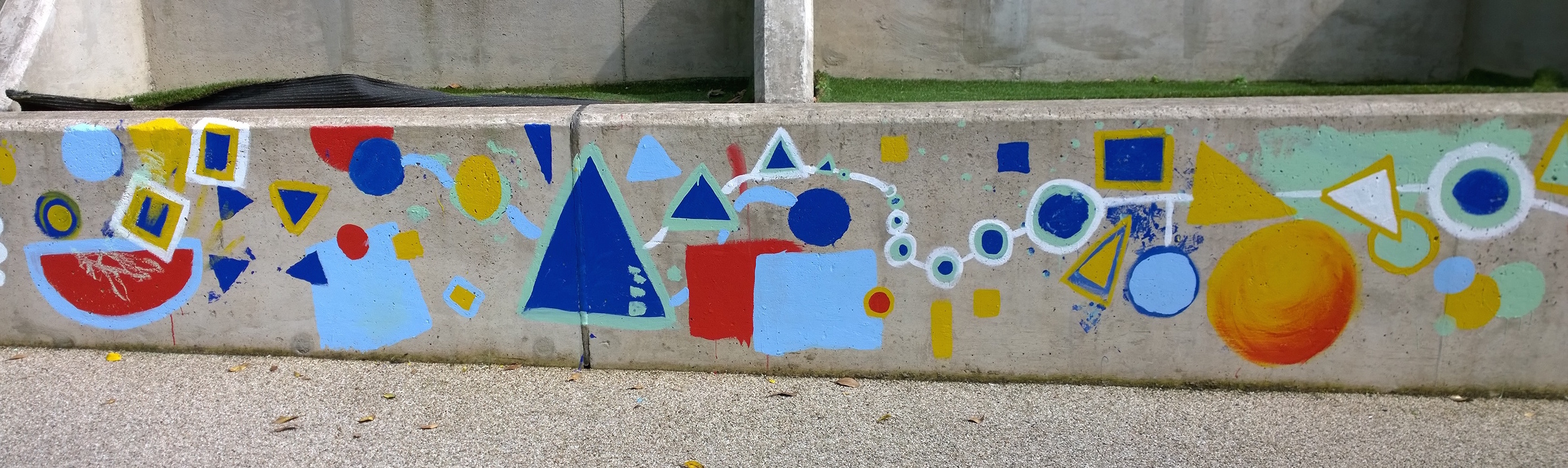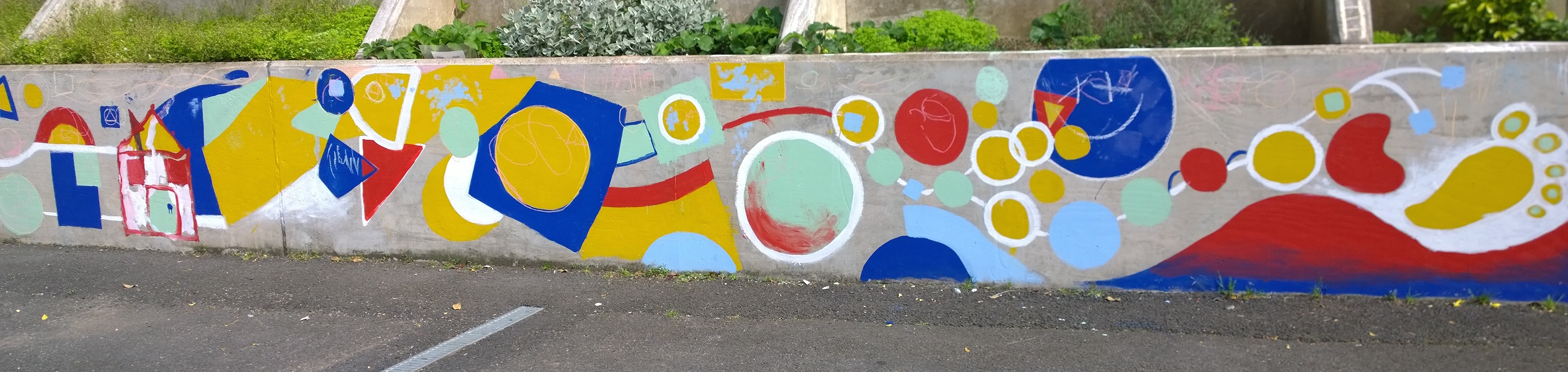 I’ve had a crazy busy summer working on projects around the country with various groups of children and young people. Project No.1 is a 30m playground mural for the Livity School in London, working with children with severe cognitive and physical disabilities, alongside students from a partner mainstream school, Dunraven. The mural is designed around simple geometric shapes and colours that can be drawn and named by the Livity pupils. They are being encouraged to draw into the mural with chalk during playtimes.