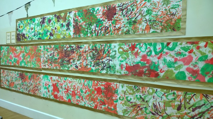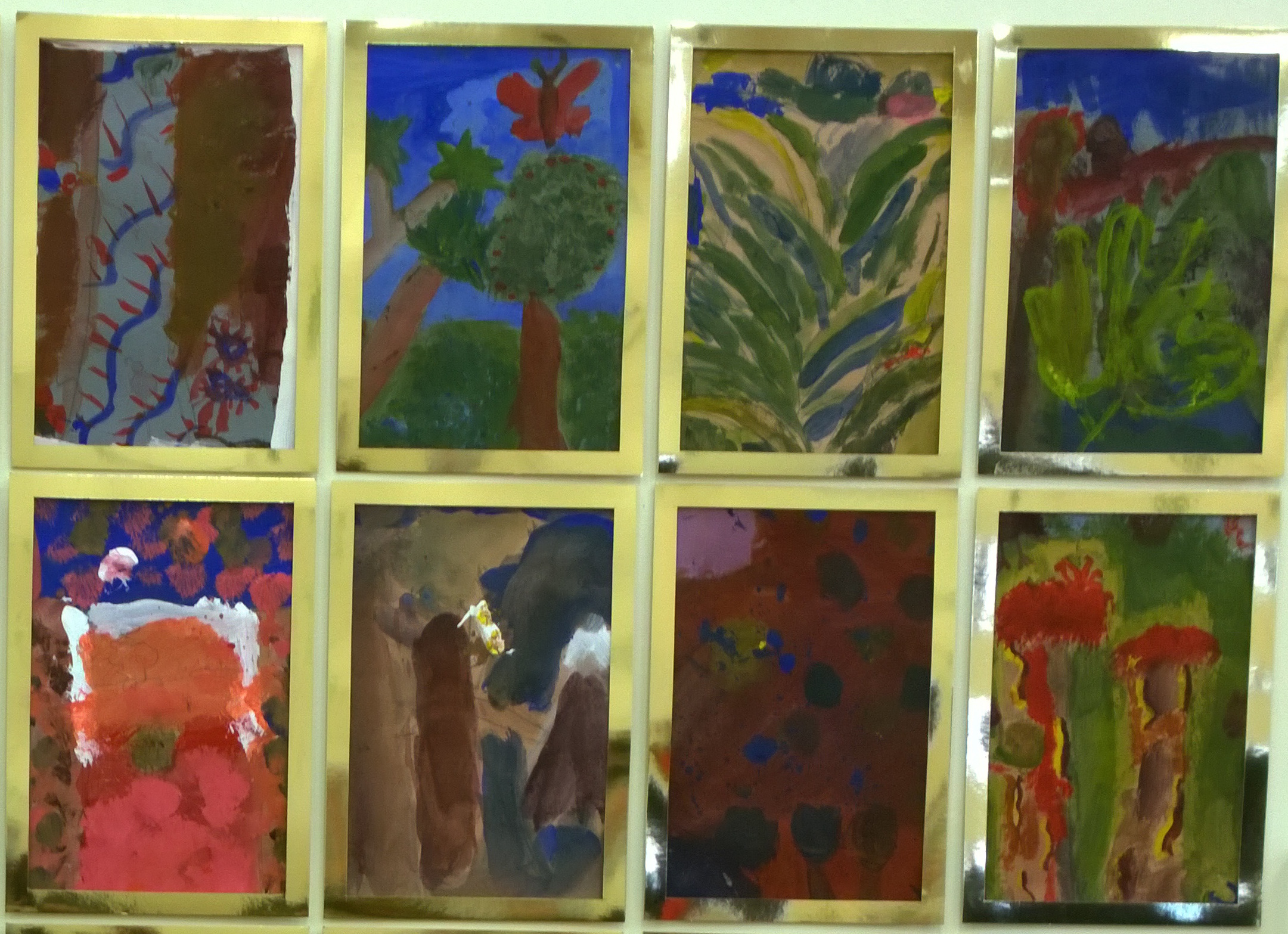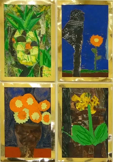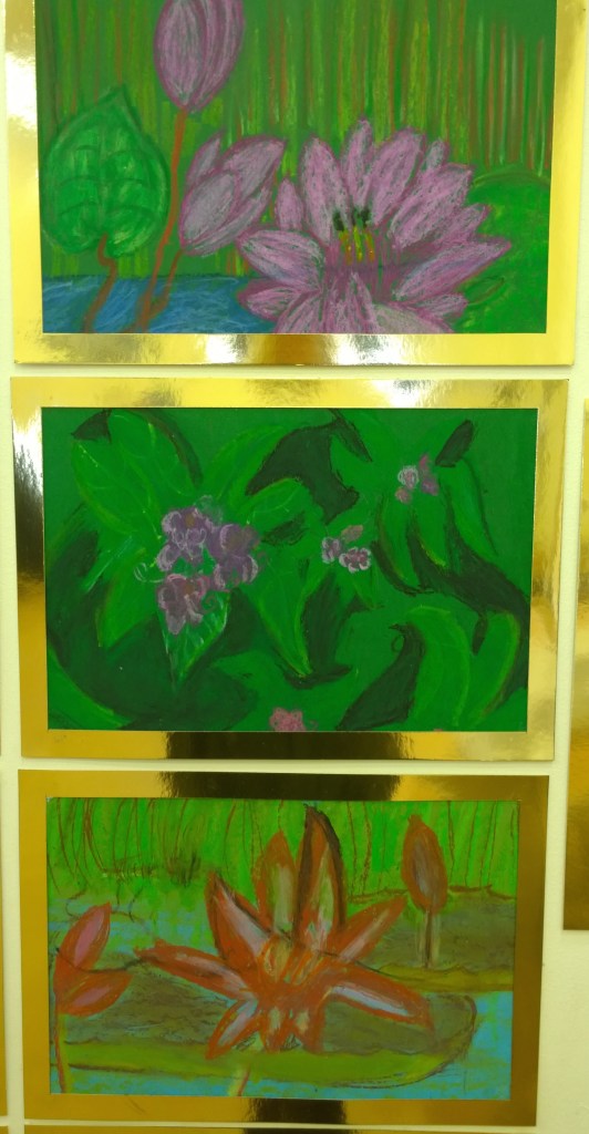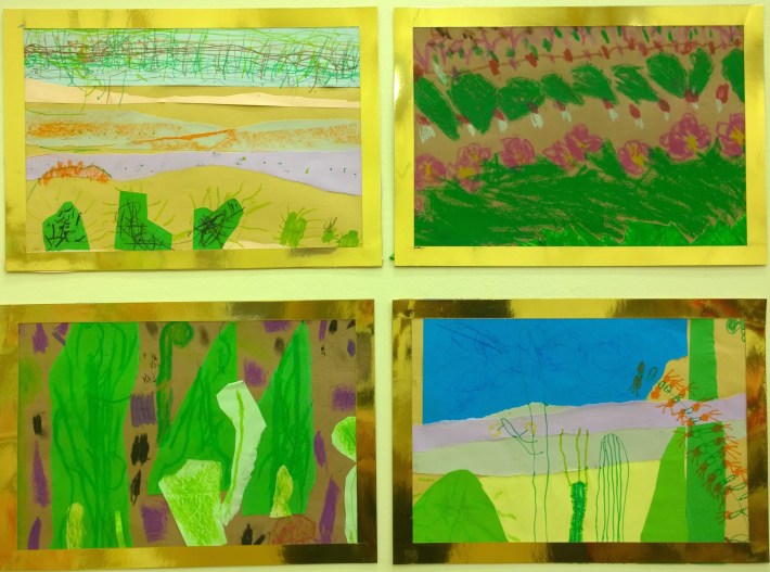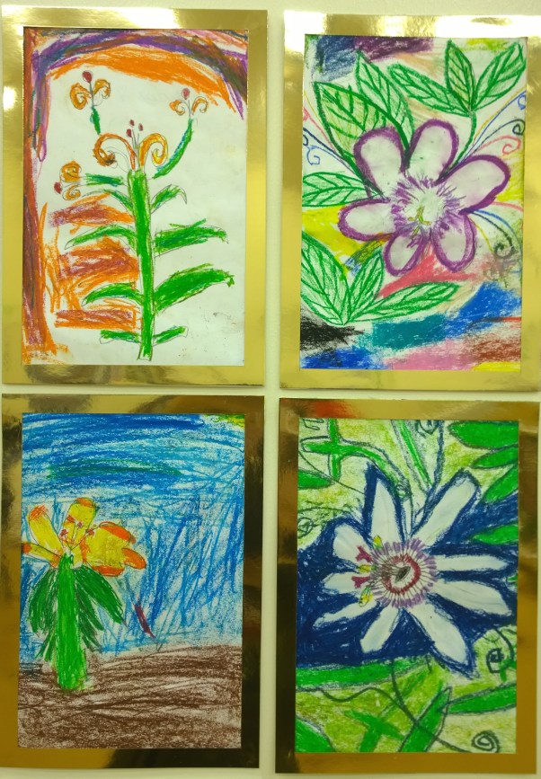 During “Marianne North Week”, I introduced the children to botanical exploration and observational drawing, as well as an array of art techniques. This culminated in an exhibition of artwork by every child in the school. The two reception classes worked collaboratively on their giant paintings (see photo above of their paintings of South African plants). The rest of the pupils created individual, A4 pieces. The art was displayed in gold frames, in close groups, similar to the way in which North’s work is presented in the dedicated gallery at Kew Gardens…